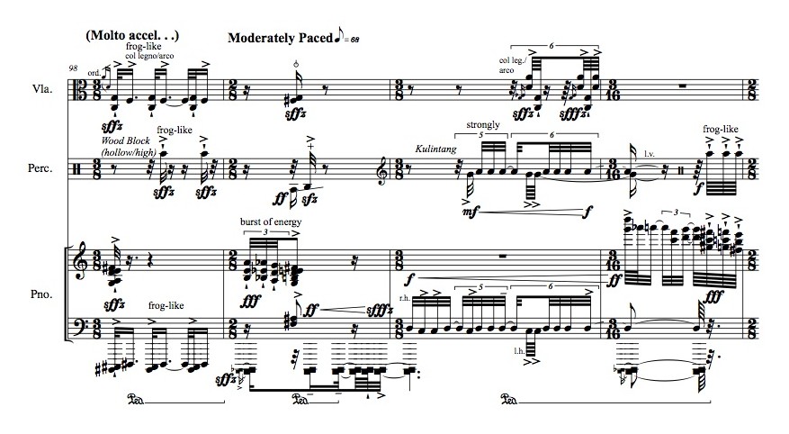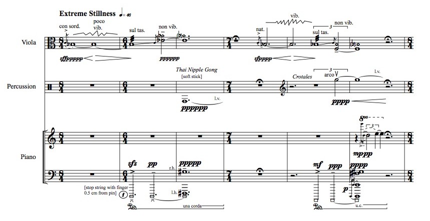 for viola, percussion and piano (2012); viola, 1 percussionist (Filipino kulintang or Cambodian korng thomm, crotales, vibraphone, hi-hat cymbals, suspended cymbal, Thai nipple gong, Peking Opera gong , Japanese Temple bowl [high], Korean ching [suspended], 2 bongos [high, middle], 2 tom-toms [middle, low], wood block [high/hollow], bass drum); Piano; duration: 14′ 00″; publisher: Australian Music Centre