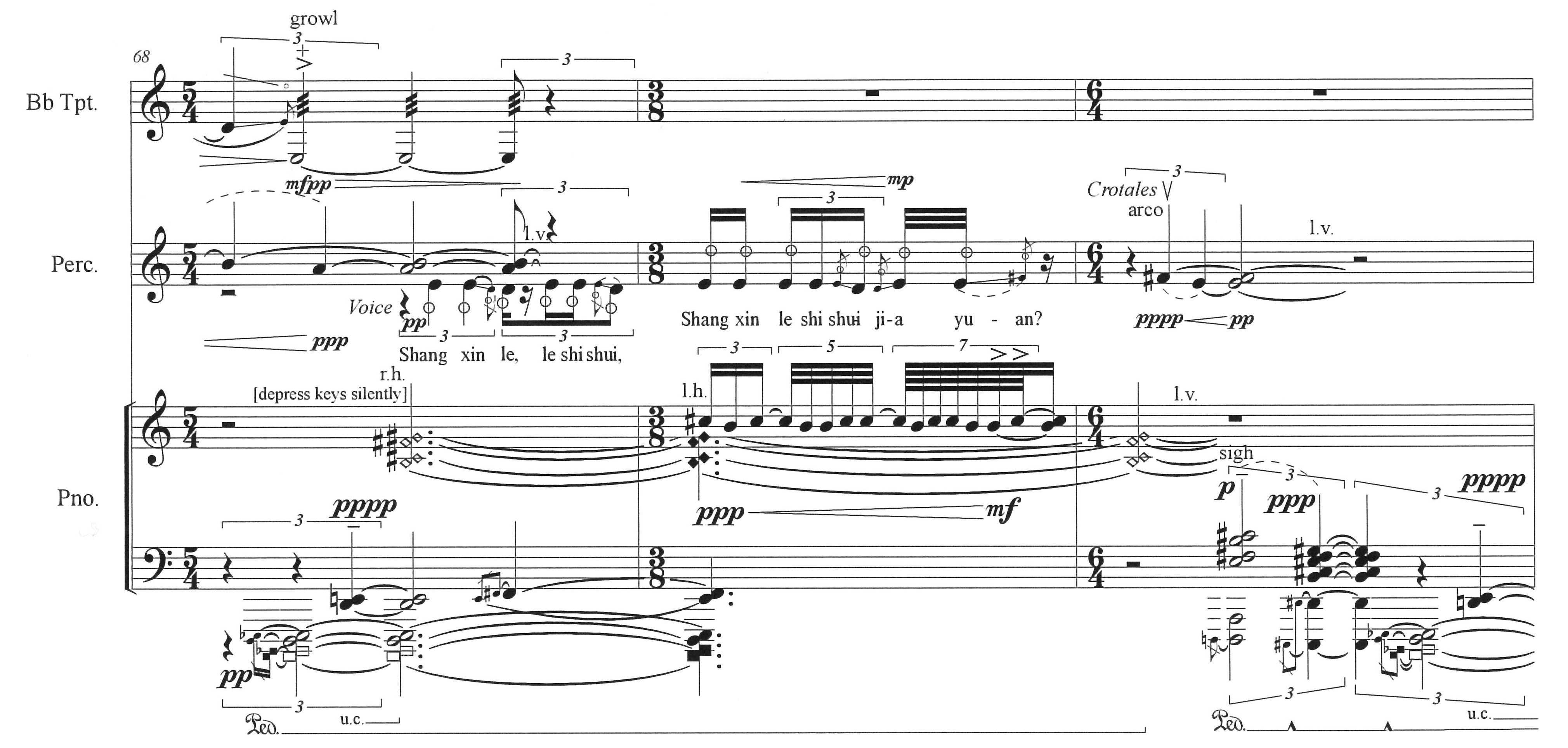 Where are the Sounds of Joy? takes its inspiration from Australian Gallipoli warrior, Billy Sing, and re-envisages his life through Kunqu—the mother form of Chinese opera, specifically the Peony Pavilion with its fragile transitory image of imagining beauty amidst the broken. It reimagines the Gallipoli war from the Chinese perspective with the metaphor from Kunqu in Peony Pavilion, of a broken down garden as the site for dreaming of the ideal lover, used as a parallel of Gallipoli as broken down walls from which one dreams of escape. The work opens and closes with half-sung, half-breath sounds on trumpet alongside emergent ‘broken’ prepared-sounds on piano, and Mandarin whisperings, whilst pure percussion colours focus to war-like Peking opera gong bursts. Restless energy starts to emerge with insistent repeated-note rhythms, whose notes fragment the Christian “Dies Irae” plainchant. These hidden fragments mix with others, such as the Turkish Kalenderi scale (related to the wandering dervishes) and makam Saba as whirling, arching quick-note bursts in the texture; they work together with explosive improvisatory generated piano licks, extended Peking Opera accelerando figures, and Filipino kulintang gong-chime repeated-note insistence as Qi-like energy. The trans-morphed gestures all push towards a chaotic cacophonic climax. A gentle section emerges centering the work with a subdued trumpet plunger tune, related to Kunqu melodic fragments; it sits amidst rich piano resonances, including silent-string evoked half-sounds, and eerie bowed crotales as an imagined dreaming of love. The music returns to short bursts of the cacophonic section, before being subdued by the recapitulation of the opening half-voiced sounds on piano and trumpet, and crotale tremolo. The work ends amidst half-resonances on piano and Mandarin whisperings—“shui jia yuan?” over the lingering Kunqu dream harmony.