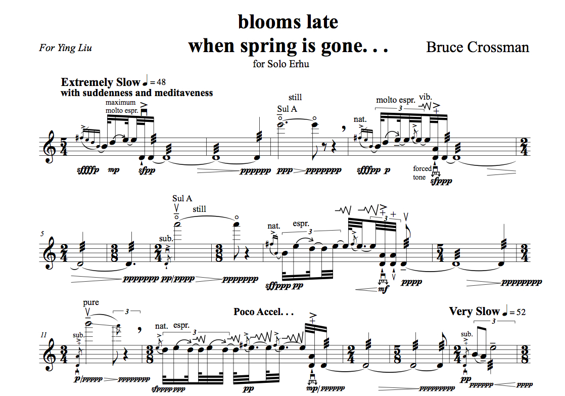 Blooms late when spring is gone… takes its departure point from Lindy Li Mark English translation of the Young Lovers’ Edition Peony Pavilion in its discussion of the metaphor of the peony as late a blooming of the possibilities within the beauty of dreams. The ghost of the Chinese opera Kunqu tune “Zao Luopao” from the Peony Pavilion hovers about as sonority possibilities within a slow melodic unfolding to ghostly harmonic moments and energy, that reveals the bones of the tune and its sonority relationship to Japanese Gagaku harmony. Structurally, the first section has fragments of the tune appear with stretched still moments that gradually focuses to the second section’s faster, energetic permeations of the material within horse-bowing sounds, vibrato and expressive slides as well as frenetically free high passages. Again, in the third section, ghostly versions of the Kunqu tune appear in sketchy harmonics which are propelled to a climactic fourth section of bends, vibrato and frenetic activity; these suddenly collapse to a returning dream-like breathy and still harmonics to close the work in a lingering way.