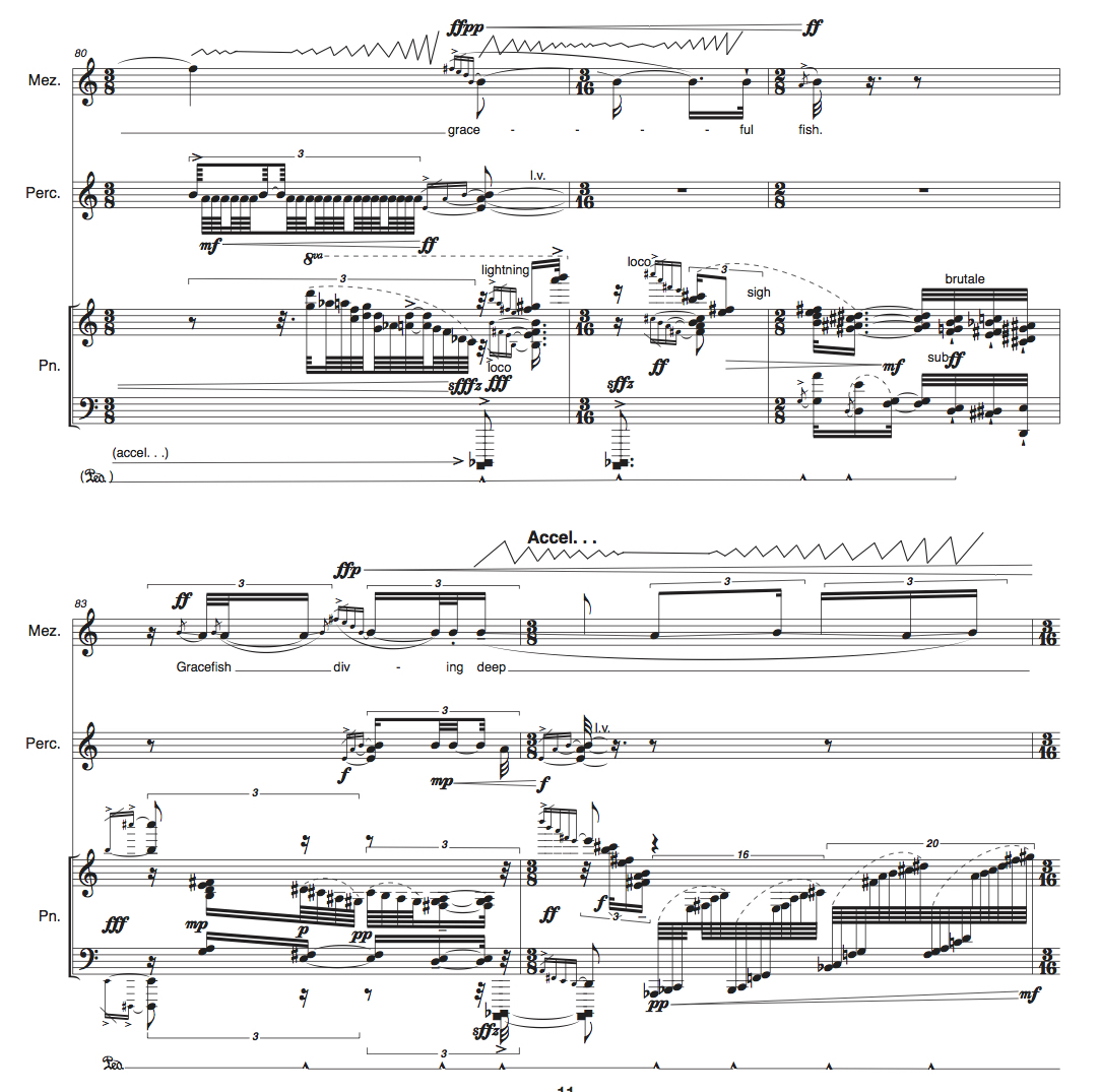 for mezzo-soprano, percussion (crotales, vibraphone, kulintang, hi-hat cymbals, 2 Peking Opera gongs [middle, high]), & piano (2017); duration: 17′ 46″; publisher: Australian Music Centre