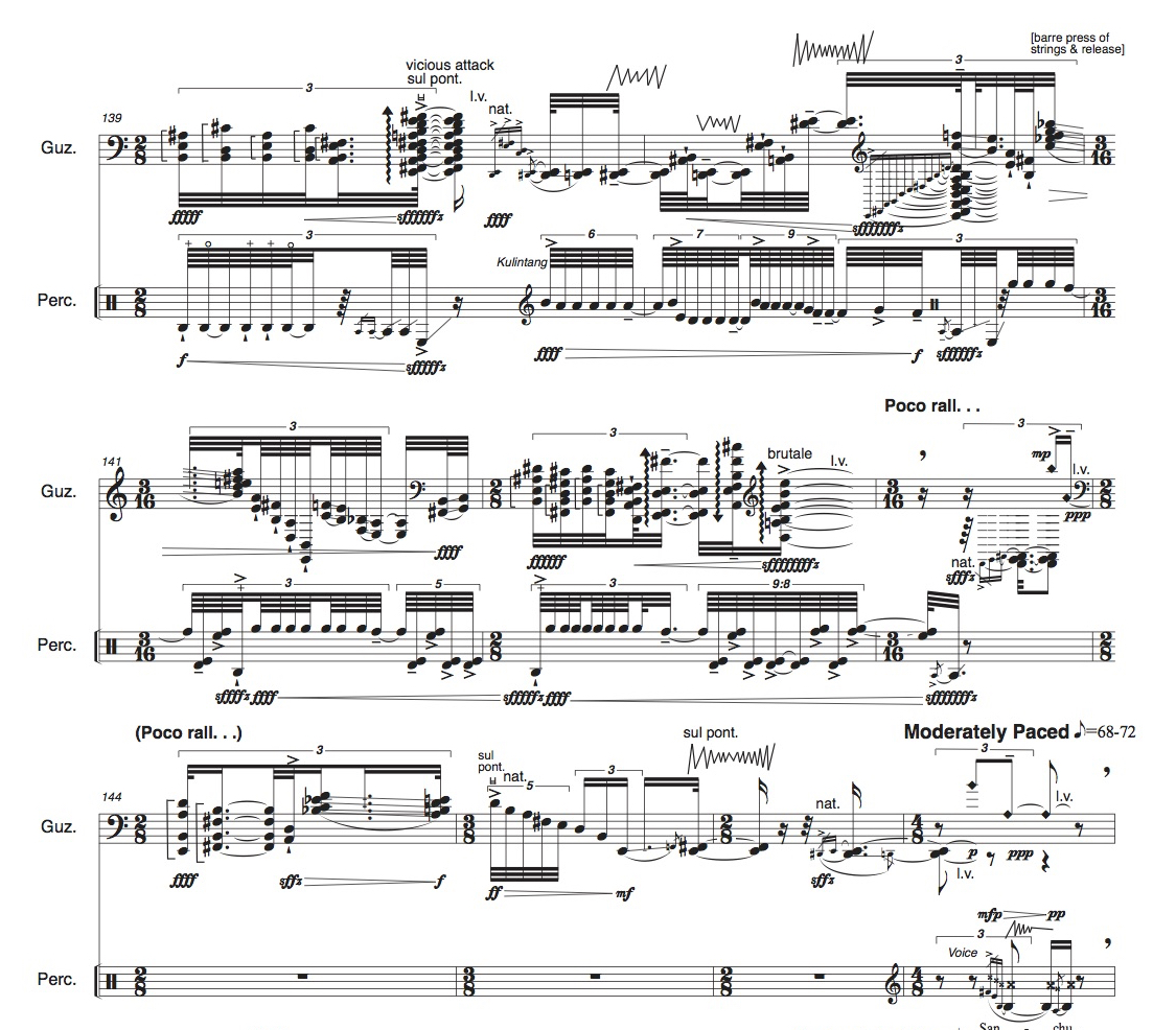 for Guzheng, 1 Percussionist (voice, crotales, kulintang [6 bossed gongs], hi-hat cymbals, suspended cymbal, 2 Peking Opera gongs [middle, high], Korean ching, 3 bongos [high, middle, low], 2 tom-toms [middle, low]) (2017); duration: 11′ 46″; publisher: Australian Music Centre