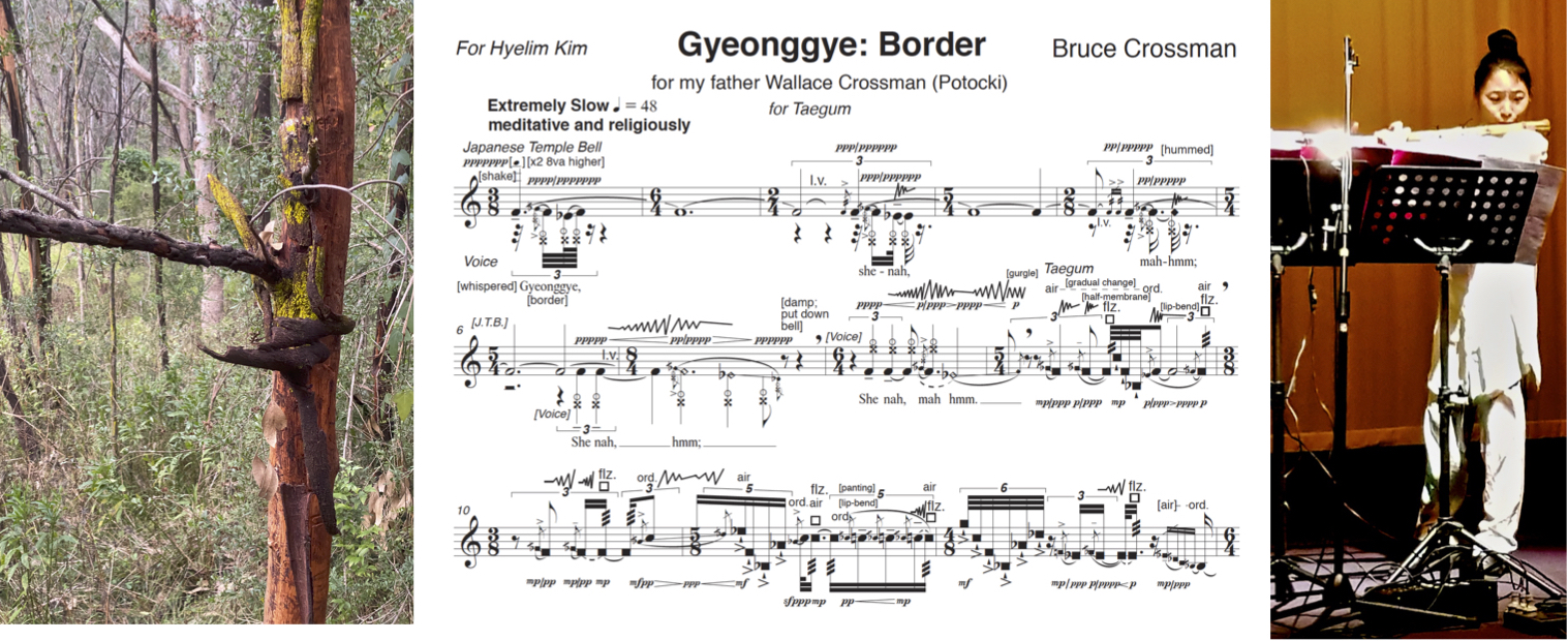 Gyeonggye: Border was sparked in my imagination by the organicism of the zig-zag organisation of a tree branch, observed during my bush walks in Mulgoa Nature Reserve near the foothills of the Blue Mountains, Sydney. Its organic rhythmics, angular and sharp, jarring things with the rhythm of nature inspired the organicism of the music, as a flow of juxtaposed living colours. Here, a living colour thread of taegŭm bamboo colours move from breath sounds to full-blown reed-membrane stridency excitations, with subtle pitch shifting, pure-to-noise notes, chant memories and air-attacks in-between. It is shaped as a cellular acceleration structure inspired by Korean Gugak sanjo structure. It moves from the gentle stillness of the opening’s Japanese temple bell resonances, broken by Judeo-Christian glossolalia chanting entwined with the Korean word ‘gyeonggye,’ and closes with taegŭm breath-drones and emergent flourishes as if signaling heaven; this double stillness frames a disruptive, accelerating middle section. Here, the taegŭm’s breath-membrane noise-purity tones gradually accrue colour density juxtaposed with moments of ecstatic inner rhythmic möt and glossolalia speaking-in-tongues chanting, towards a controlled free improvisatory space for the performer. Its timeless space allows the player room to create whooping sweeps of colour and breath-to-tonal bends, towards ripping up the motif structures in a liberamente free-joy. In this sense, the unpredictable improvisatory ripping up of the breath colours as spirit movement in the music, was inspired by Chinese painter Cai Guo-qiang’s gun-powered exploding of calligraphical painting towards spirit, that Hyelim and I had witnessed together in Melbourne last year. The pulsing juxtaposed colours of the taegŭm are a type of symbolic life pulsing, as spirit crosses from heaven to earth and earth to heaven, as a tribute to my father’s border crossing to heaven this year.