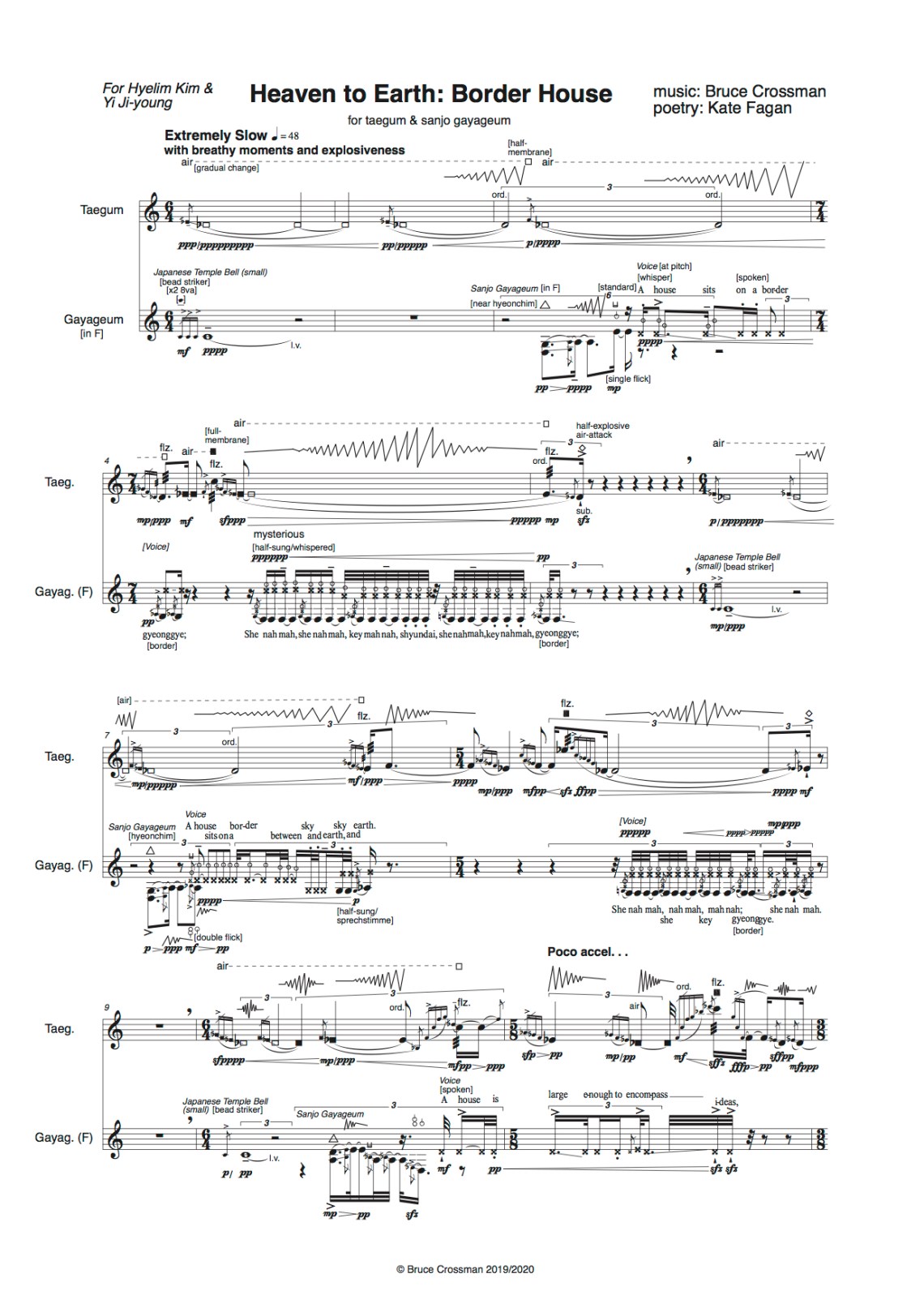 Heaven to Earth: Border Housewas written for Hyelim Kim (taegŭm) and Yi Ji-young (sanjo gayageum) in collaboration with poet Kate Fagan. It is part of a multidisciplinary creative project between Korea and Australia with traditional Gugak performers Hyelim Kim and Yi Ji-young, performance poet Kate Fagan, jazz bass performer Waldo Garrido, and filmmaker Vincent Tay.