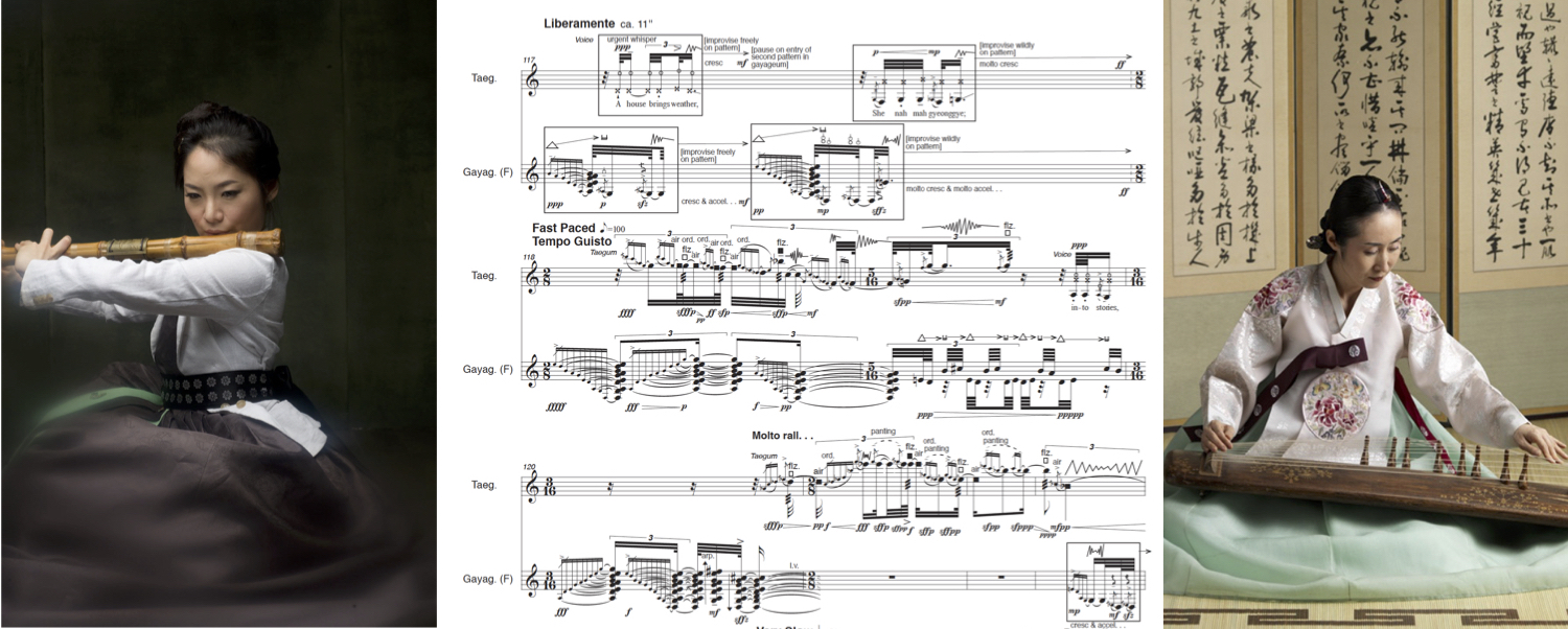 for Taegŭm and Sanjo Gayageum in F (12-strings) (NB the score is written in F for the sanjo gayageum part, sounding P5 lower) (2019-20); duration: 18′ 05″; publisher: Australian Music Centre