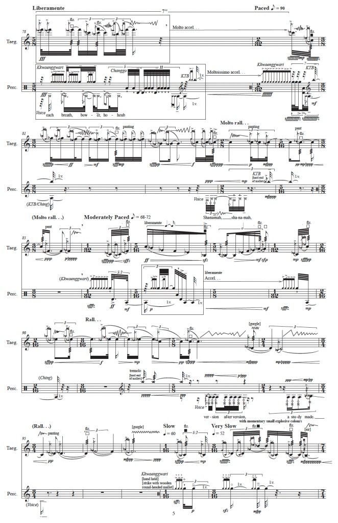 Hoheub: Every Last Breath (for taegŭm and percussion) is about breath (in Korean, hoheub) and celebrating the spiritual presence in nature, especially in the Judaic-Christian sense of ‘something which is driven along with miraculous power resplendent in light through the totality of creation’ in birdsong/nature, with every last breath—even when every breath is painful. It includes Kate Fagan’s beautiful poem about breath and finding beauty in bower birdsong, even when things are painful. The piece is like one massive breath which expels air—pain, beauty, and praise. It forms the sonic basis for Vincent Tay’s film shot in Mulgoa Nature Reserve exploring the presence of the transcendent energy of nature. The structure of the music for the film is a three-part mosaic: part one explores flourish and breath motifs, including chanting of Judeo-Christian glossolalia phonemes—a mysterious spiritual communication; part two explores the flourish idea to lead to taegŭm scalic athleticism and percussive bursts; whilst part three transitions back through the scalic runs/percussive bursts to the flourish and breath motifs’ dissipation of the energy, to focus on the Korean word sangchan—a type of ecstatic praise. The first part is where the taegŭm gradually breathes to life with the sudden noisy-breathy melodic angularity inspired from the syncopated Mulgoa tree branches, with traditional Korean metal percussion—kkwaenggwari, ching and Korean temple bowl resonances—startling and lingering high and low around Kate Fagan’s words about beauty in birdsong but linked to emotional pain. The second part is where the taegŭm breaks out into ecstatic birdsong, working almost combatively against percussive skin sounds from the Korean changgo (double-headed skin drum). The two performers work with poetic chant and free mobile sections that allow ‘ripping it up’—in the Cai Guo-Qiang gunpowder sense of exploding the ideas unpredictably—with improvisatory rough Mahk-like gestures that reveal spirit in their intensity as a type of ecstatic inspired-birdsong from Mulgoa Nature Reserve. The third part of the music returns to ringing metal kkwaenggwari, ching and Korean temple bowl resonances as the taegum gradually burbles, burst in colour utterances, and elongates in into long-drawn breath notes that gradually evaporate into the air resonances with Korean temple bowl ethereal sounds.