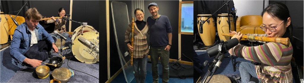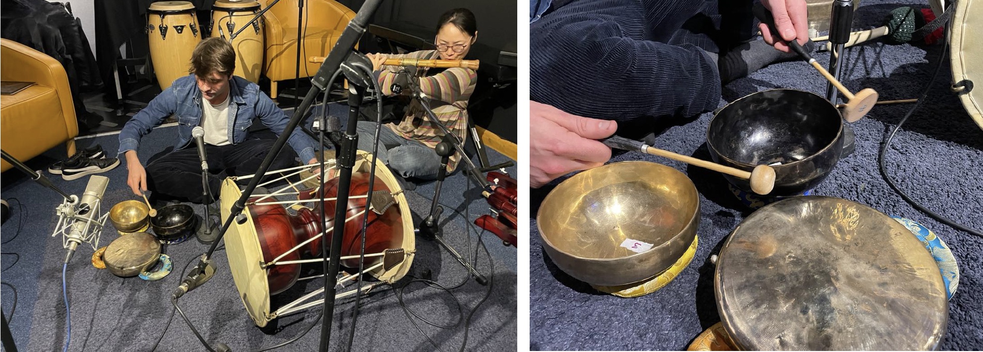 James Larter (percussion) and Hyelim Kim (taegŭm) in London at Stella Polaris Studios, 21st November 2023; Mulgoa Nature Reserve, Western Sydney, Sunday 10th September 2023 (photos: Øyvind Aamli; Bruce Crossman).