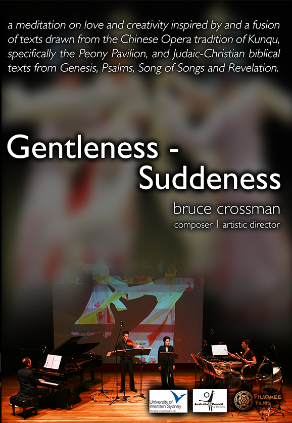 ABC Classic FM radio Broadcast: a feature program on Bruce Crossman’s Chinese-opera influenced Gentleness-Suddenness (mez, vln, perc, pn) as well as other works, and some exciting Korean kayageum and Cantonese Opera as a context to the musical thought.