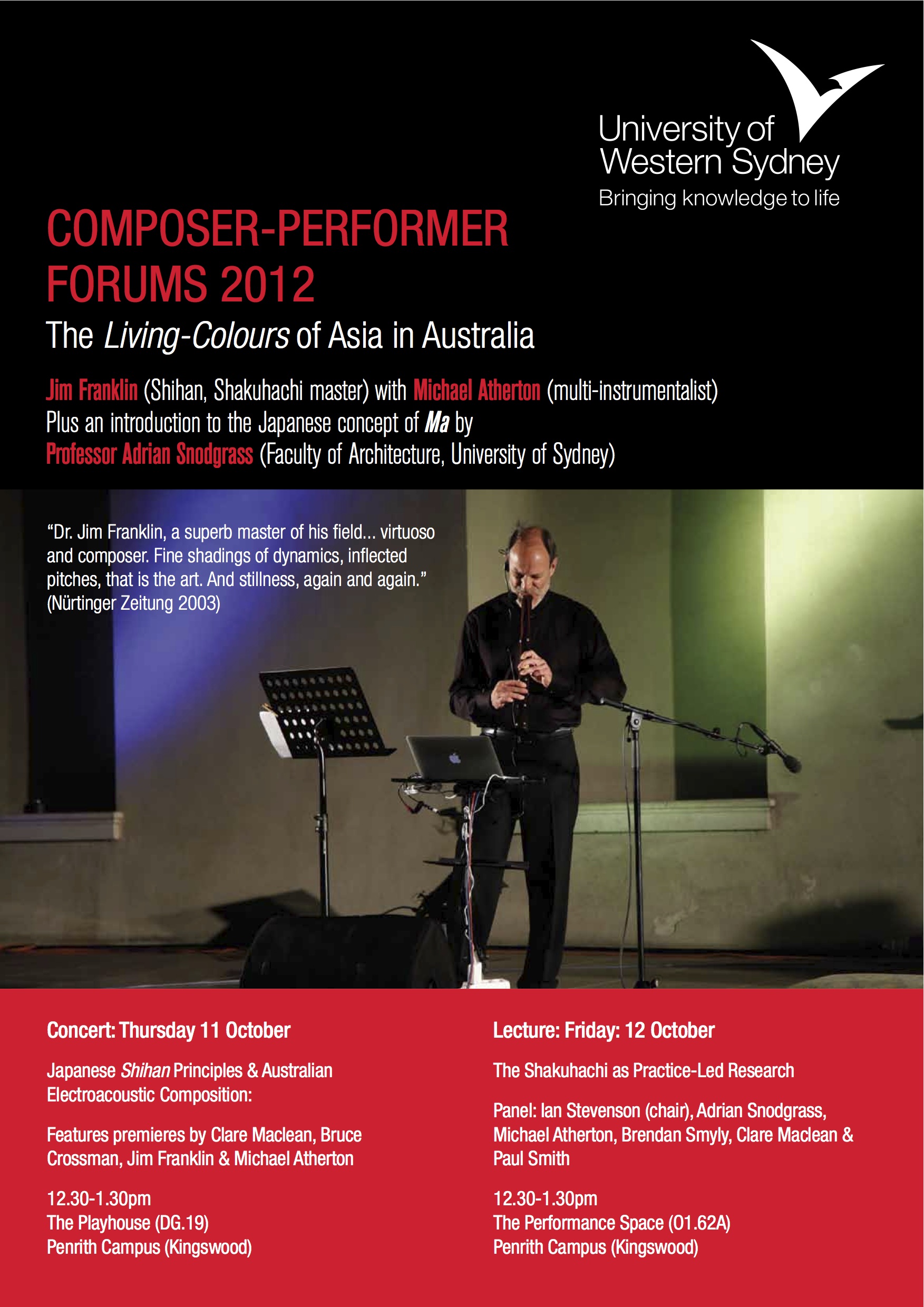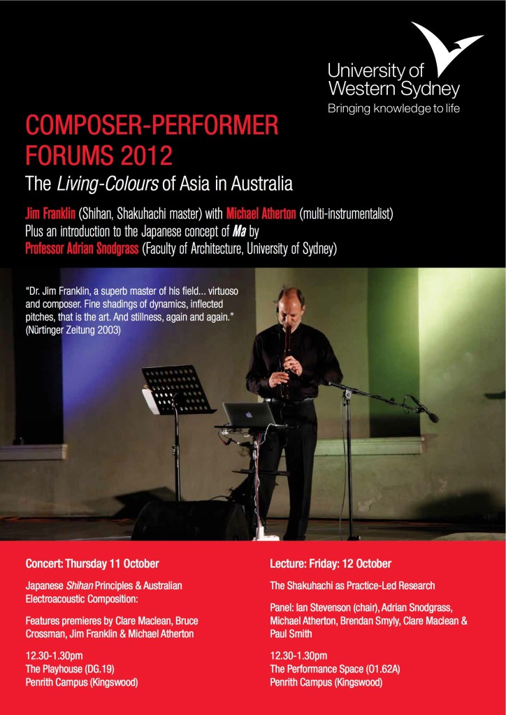 In Gentleness and Suddenness, Composer-Performer Forums 2012: The Living Colours of Asia; Japanese Shihan Principles & Australian Electroacoustic Composition, The Playhouse, University of Western Sydney, 11 October 2012