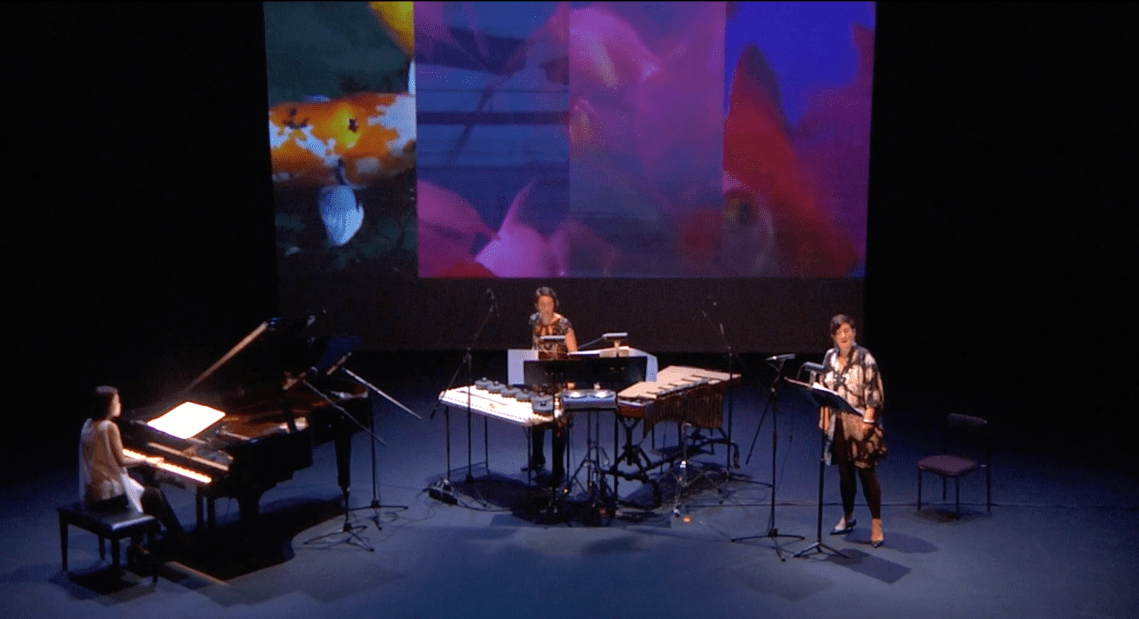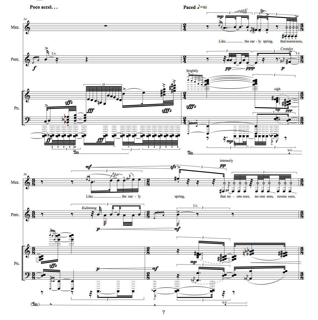 This music-theatre work—Shy Like Blushing Flowers—is a collaboration between Australian artists Bruce Crossman (composer/musical director), Simon Killalea (video artist), Ian Stevenson (sound design/diffusion) with performers Anna Fraser (mezzo-soprano), Claire Edwardes (percussion) and international collaborator Linda Yim (piano) from the renowned Hong Kong New Music Ensemble (HKNME). The springboard for this work is the text of Tang Xianzu’s Chinese opera “Peony Pavillion,” with hints of the Judeo-Biblical text “Song of Songs” and Shakespeare’s “Antony and Cleopatra”. From distinctively diverse cultures, these works appeared at both juxtapositional and similar times (1598 and 1606 respectively) and correlate thematically, exploring love permitted to exist as dream merged with reality, and the subsequent temporal/spatial separation of lovers (human and spiritual) and connection to Daoist “dao” and Christian “spirit.” The central protagonists from these classical works, the vivacious unmarried female and high status queen, are reinterpreted as a single persona in an intercultural fusion of gritty tension with poetic lushness, bringing about a deepening mutual understanding of Australian/Chinese cultures towards a contemporary Asian-Pacific artistic identity. Its multicultural nature aims to directly synergize English and Mandarin sounds as both a form of communication and as delicate and vigorous sound patterns within a Confucian living-colour aesthetic in music-theatre.