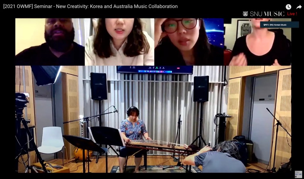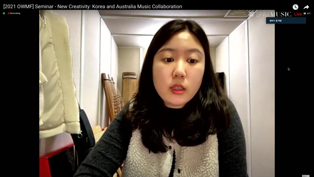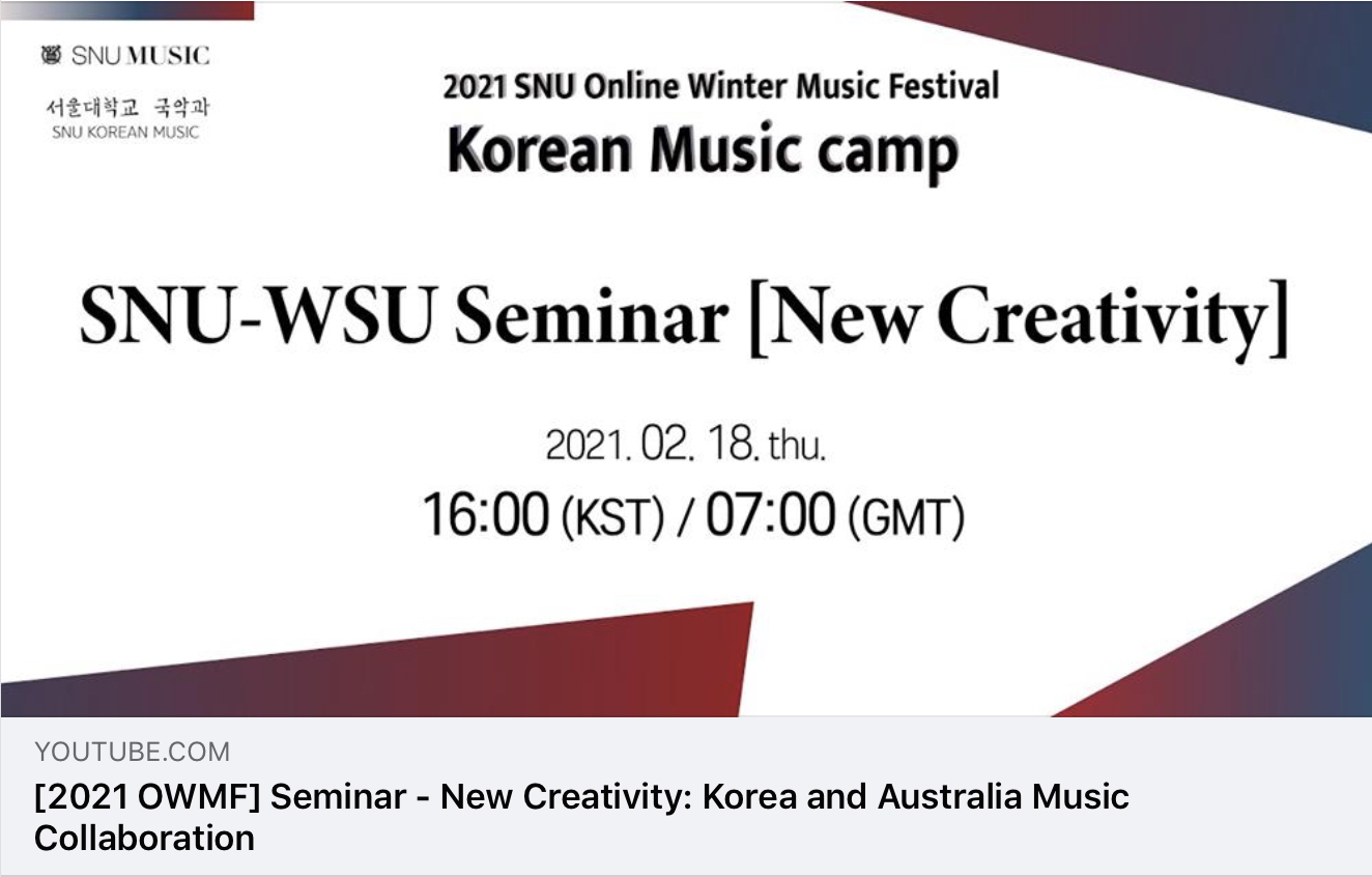 Heaven to Earth: Border House (sanjo gayageum, taegŭm) and Gyeonggye: Border (solo taegŭm) were featured in the seminar New Creativity: Korea and Australia Music Collaboration at the Korean Music Department, College of Music at Seoul National University’s 2021 SNU Online Winter Music Festival: Korean Music Camp on Thursday 18 February 2021.