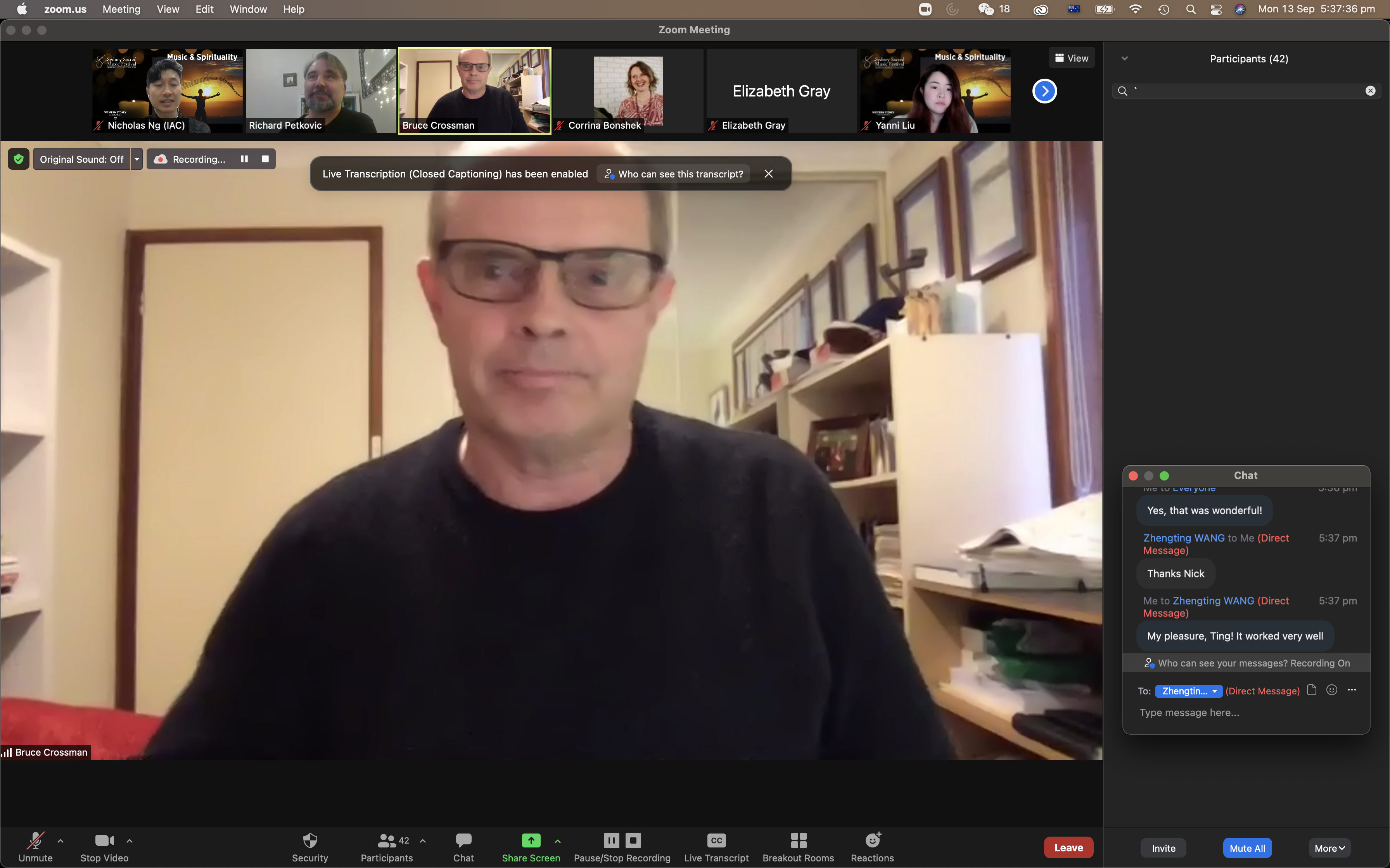 Bruce Crossman presents a Keynote on Strange Invisible Perfume at the Music & Spirituality Symposium, Sydney Sacred Music Festival and the Institute for Australian and Chinese Arts and Culture (IAC), Western Sydney University, 13 September 2021. He will speak on his approach to creativity, ‘Dangerous Ideas for Creativity—Allowing the Spirit to Sing,’ including on an intercultural collaboration with the Hong Kong-based guzheng performer Chiu Tanching.