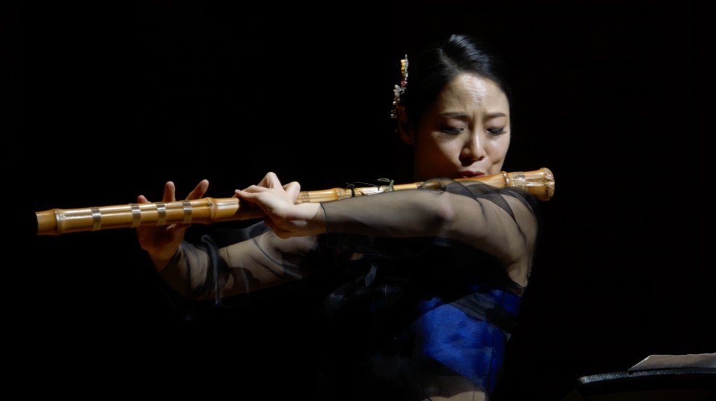 The filmmaker Pedro Velasco perfectly caught the shift between worlds with suggestive early morning light changes amidst Buddhist symbols of Korean Temple bowl and Gugak taegŭm performer transforming in light as frames to the film. In the middle, as she promised, Hyelim ripped up the score using the aleatory to attack with breath and rip into the buzz of the reed membrane (ch’ong) amongst flourishing court taegŭm tuning on accelerating and deaccelerating and mobile segments. Poignantly, Velasco contrasted this heavenly exuberance in Hyelim’s playing with shots in nature of passageways with hints of gravestones—the ironic tension underscoring and heightening the sadness of loss.