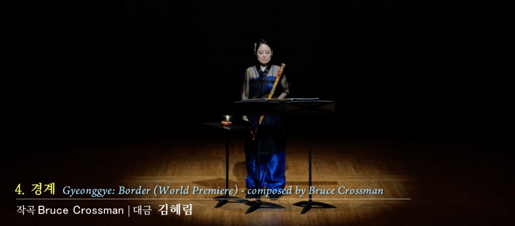 Bruce Crossman’s Gyeonggye: Border (solo taegŭm, voice, Korean Temple bell) was featured by Korean taegum virtuoso, Hyelim Kim at her 2022 Hyelim Kim Daegeum Recital—Tradition and Creativity, National Gugak Center, Pungryu Sarangbang (chamber concert hall), Seoul, South Korea on 9 February 2022.