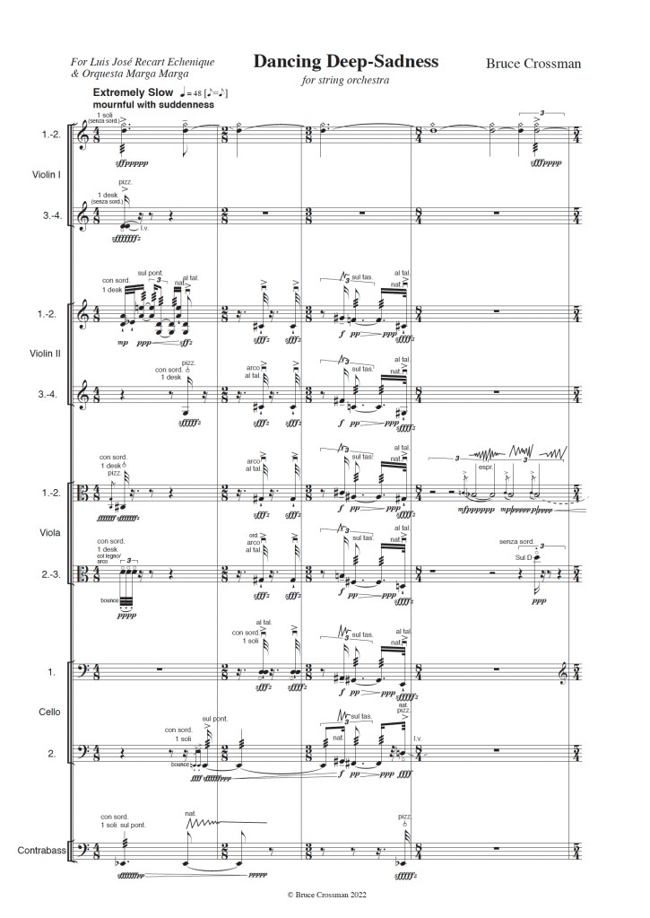 Dancing Deep-Sadness was commissioned by Dr. Andrián Pertout and is dedicated to Luis José Recart Echenique (conductor and artistic director) with Orquesta Marga Marga. The music was developed for the Orquesta Marga Marga, based in Chile, during a time of sadness for me, after the passing of my father before the chaos of the worldwide pandemic numbed emotions. The music works as a type of sad emotional residue in its static chromatic sonorities where hints of dance energies—Afro-Cuban salsa son clave and free-jazz energy—crash into distilled spectrums of interval-rich clusters and shimmer chords in slow slabs of sound, inspired by the ritualised stasis of Japanese Gagaku music. The living life thread through these oppositions is a changing timbre coloured solo viola line inflected with Korean gayageum-like rough ‘inside-the-note’ colour changes that gradually accelerando to an intensification dance moment and then rallentando to almost nothing, ended by a sudden salsa flourish.
