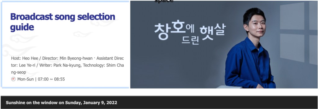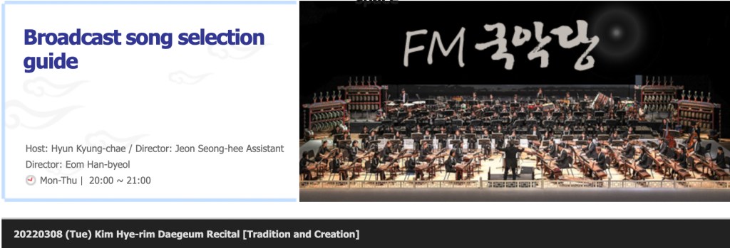 Heaven to Earth Border House (taegŭm, gayageum with poetry by Kate Fagan) (performers: Hyelim Kim, Yi Jiyoung) was featured on the radio programme on the 9th January 2022 on Sunshine on the Window, “Scent of Sound,” K-Music, Gugak FM Inc, 7-8.55 with Heo Hee (host), Min Byeong-hwan (director), Lee Ye-ri (assistant director), Park Na-kyung (writer) and Shim Chang-seop (technology), Seoul, South Korea. Also, Gyeonggye: Border (solo taegŭm) (Hyelim Kim) was featured on the radio programme on the 8th March 2022 in Kim Hye-rim Daegeum Recital (Tradition and Creation) K-Music, Gugak FM Inc, 20.00-21.00 with Hyun Kyung-chae (host), Jeon Seong-hee (director), Eom Han-byeol (assistant director), Seoul, South Korea.