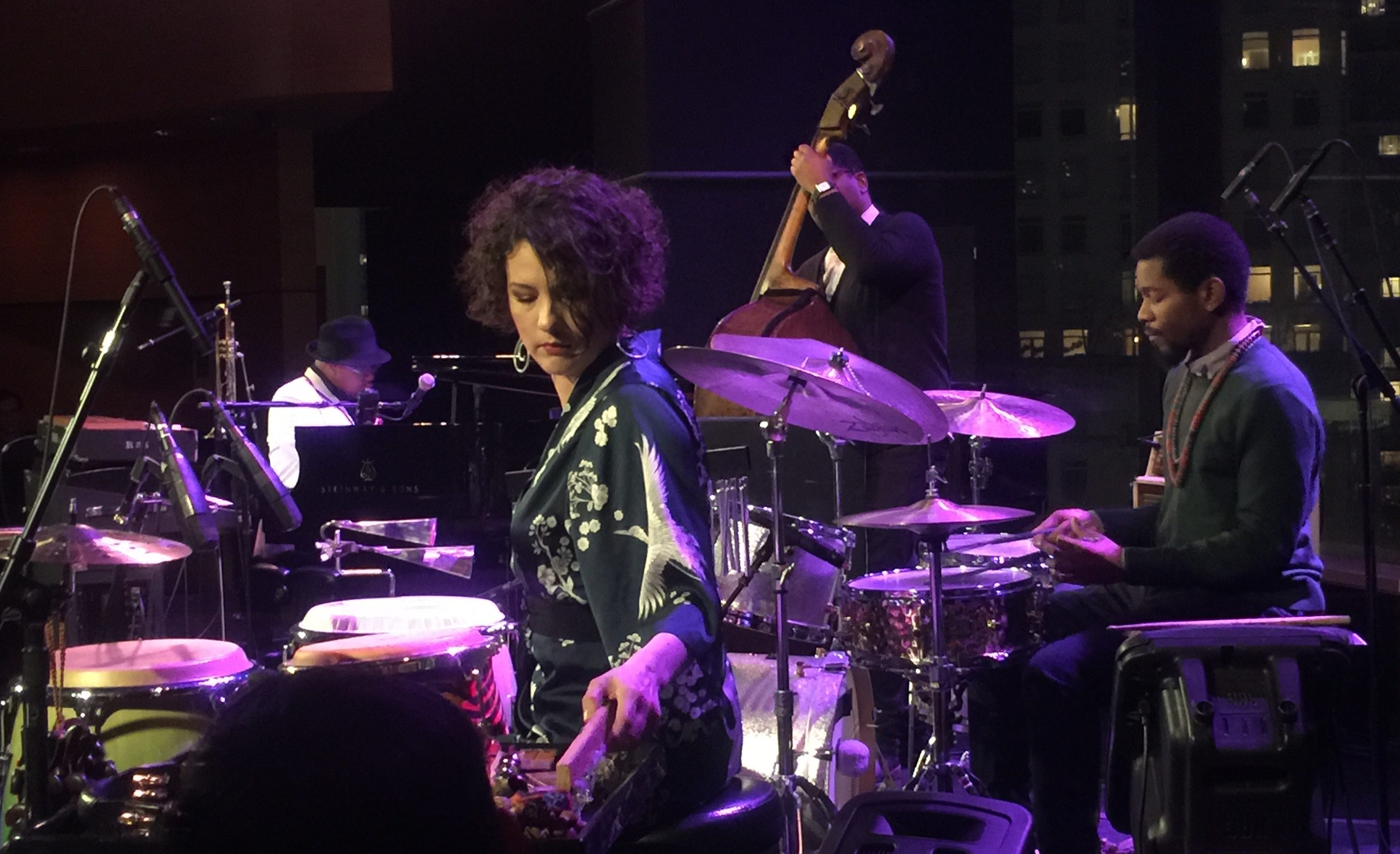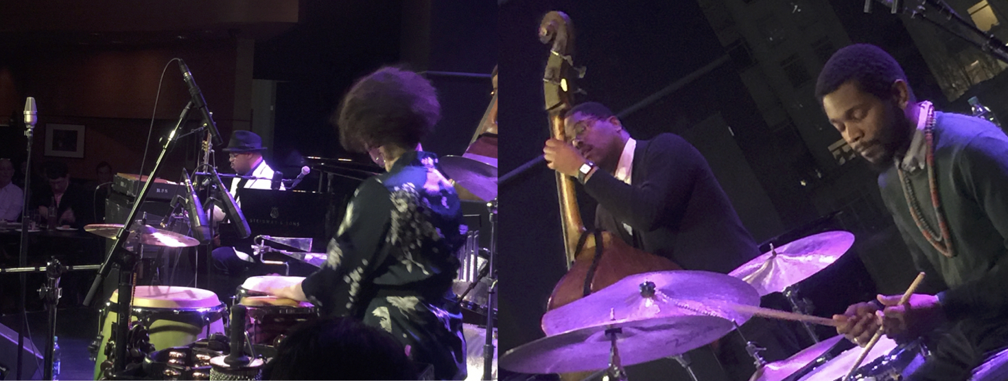 As a composer, I felt that the sharp, understated polite articulation of New Yorkers lived in the live-jazz I heard at the Lincoln Centre on Sunday night. The Nicolas Payton Quartet crackled into the air in the fifth-floor curvaceous jazz venue of the Lincoln Centre. It seemed that the s-shaped walls, almost like a half-curved treble clef, were actually the music emanating from the band. Payton’s opening haunting colouristic chords, subtly stalked and layered the air in perfume-like moments of rich float-chords stacked to dissonant lingering moments of play. This unassuming but subtle play spread through the quartet: the caressed skin drums of Jacquelene Acevedo, whose subtle Japanese floating-world sounds and Hokusai-like designer clothes, answering Payton’s arioso-piano notes, as if the two were one without looking; drummer Joe Dyson, with his discreet lithe-physical presence, set up disciplined and concise rhythmic propulsion with subtle placed explosions of snare-rim shots in colour exchanges with the mute skin-drum moves of Acevedo. Overlapping complexity of