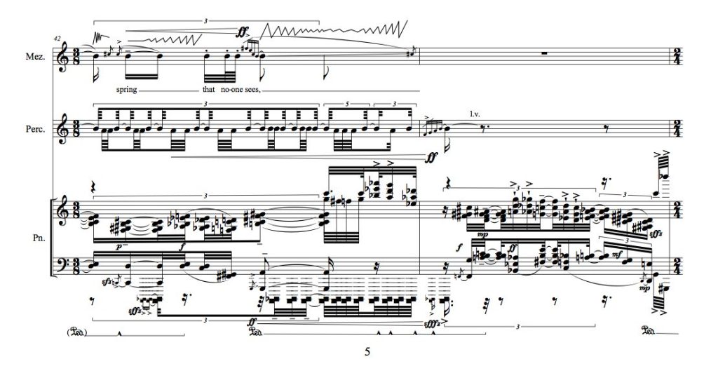 vocal lines in my musical score. This movement of the music-theatre work is titled “Garden of Fire”; I have not forgotten the veracity and visceral energy of Hong Kong-based pianist Linda Yim’s interpretation of the volcanic colour moments of stasis contained in the score. Nor have I put aside the quivering guzheng tones of Chiu Tanching’s realisation of lingering delicacy of sonic line in her interpretation of the work (see Figure 1). The situation was the trying out of some initial sketches in snatched moments of the music as a workshop rehearsal in December 2016 under the careful guidance of the Hong Kong New Music Ensemble artistic director, William Lane. This score has been stripped to its essence for an experimental re-working of it in trio form with the visuals of Sydney-based projectionist Simon Killalea as a counterpoint at the Joan Performing Arts Centre in October 2017. The trio version (see Figures 2 and 3) will involve soprano Anna Fraser (Song Company), percussionist Claire Edwardes (Ensemble Offspring) and pianist Linda Yim (HKNME) in a live performance with real-time digital visual mixing by Simona Killalea. In this stripped version, the wriggling vocal lines are laid bare, with delicate bowed vibraphone ebbing joining the dark gong-like stopped notes bedding the vocal beneath, with interpretations of the spaces through metaphorical nature and cityscape images of Hong Kong in time-lapse filmmaking.