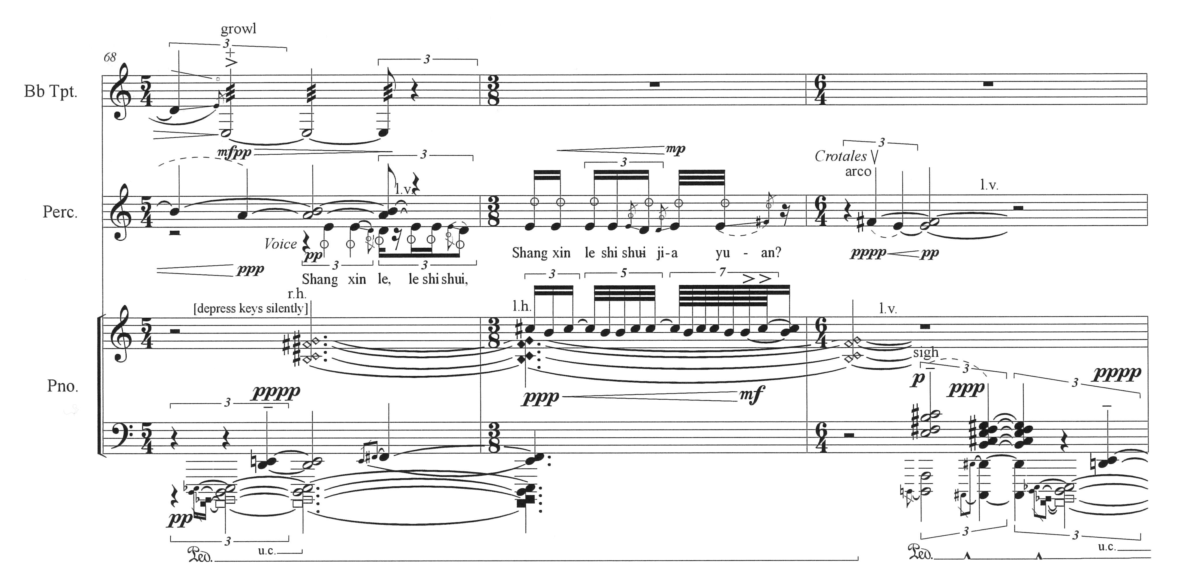 These entanglements of energy as creative expression found form in my music’s sensual sonorous moments and erupting cacophony caught up in the flow of colouristic changes in Where are the Sounds of Joy? The energy—born of pianistic improvisation and Judeo-Christian meditation—becomes a flow through the landscapes of sound, such as Chinese opera accelerating Peking opera cymbal patterns used in military scenes, Chinese Kunqu lyricism’s interval sonorities, Filipino kulintang percussion patterns, Chinese Confucian multi-timbre changes of tones, and American influenced free bluesy-based improvisation drawn from Medeski, Martin and Wood. I later worked with my friend, the painter Luping Zeng, to create this sense through visual juxtapositions of painterly energy to accompany the music via film. Entangled melodic lines and rich chords with chromatic juxtapositions in my music found equivalents in Zeng’s naked female dancer body movement images isolated with glowing reds, yellows and the symbolic love greens. What holds the diversity together is the prism of Chinese literati influenced gestural energy—gentleness-suddenness moments of forcefulness amongst resonance in Ho’s sense, that give the creative voice its identity and clarity as living colours.