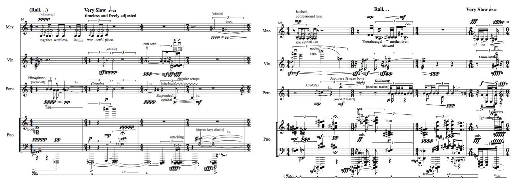 These memories of culture and spiritual presence intermingled in my mind whilst writing my Chinese opera influenced music-theatre work, Gentleness-Suddenness. In its language a cultural mixing of the translucence of Kunqu’s classic opera, Peony Pavillion, especially in Lindy’s Li Mark’s lucid English translations, where moments of word sensuousness float with the extended statically floating vocal lines of the form seem to mix with the ringing undampened resonances and French colour-focussed sonorities of my own musical language. I am reminded of musicologist Jane Davidson’s ideas on performance where conceptualizations and physical space provide a subconscious palette for creative musicians. The physical act of my own composition embodies the mixture of Kunqu memories with French interval-colour sonority sense and presence nature of East coast Australian bush as a palette of ideas merge as musical utterance in my creative thought. The way these flow in performance is not as a fixed point of exactness, which have only one interpretation, but rather as wide open spaces of flow between performers and their negotiated cultural memories and presence in performative space. In short, the resonance of memory conditions active creativity.
